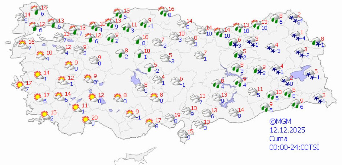 Kar yağışı simgeleri doğu illerde yoğunlaşırken, ülke genelinde soğuk ve bulutlu hava koşulları devam edecek.